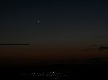 Diese Aufnahme entstand am 01. April 2010 um 21:05 MESZ mit einer Canon 350D bei 1600 ASA, 80mm Brennweite, Blende 4,7 und 1/5 sek. Belichtungszeit bei wechselnder Bewölkung. Links im Bild Venus, rechts unterhalb davon der deutlich lichtschwächere Merkur. Beide sind leicht mit bloßem Auge zu sehen. Im Leica 10×25 stehen beide zusammen in einem Gesichtsfeld, so dass ich bereits um 20h MESZ beide Planeten in heller Dämmerung leicht zwischen den Wolken finden konnte.