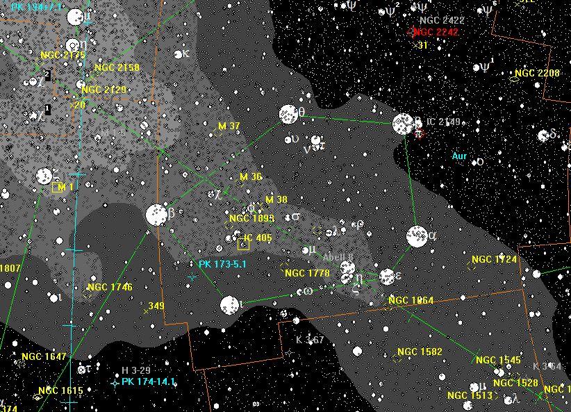 Manchmal fotografiere ich jedoch mit sehr kurzer Brennweite, beispielsweise hier das Sternbild Fuhrmann mit 32mm: