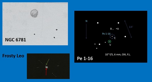 NGC 6781, Pe 1-16 und Frosty Leo erläutern gut die Vielfalt, die bei PN zu beobachten ist. Und es kommen auch Instrumente wie eine 105mm f/1,2 Kamera oder ein 10“ Dobson zum Einsatz, also kein überteures und übergroßes Equipment.