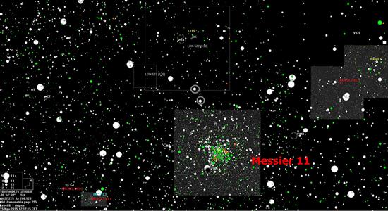 The asterism is located about 30 arc minutes NNE of the center of Messier 11. Two stars of 10.5 mag point the way from Messier 11. They are half way from the center of M11 to Leiter 15. Below you find one finder-chart for the object (click to enlarge).